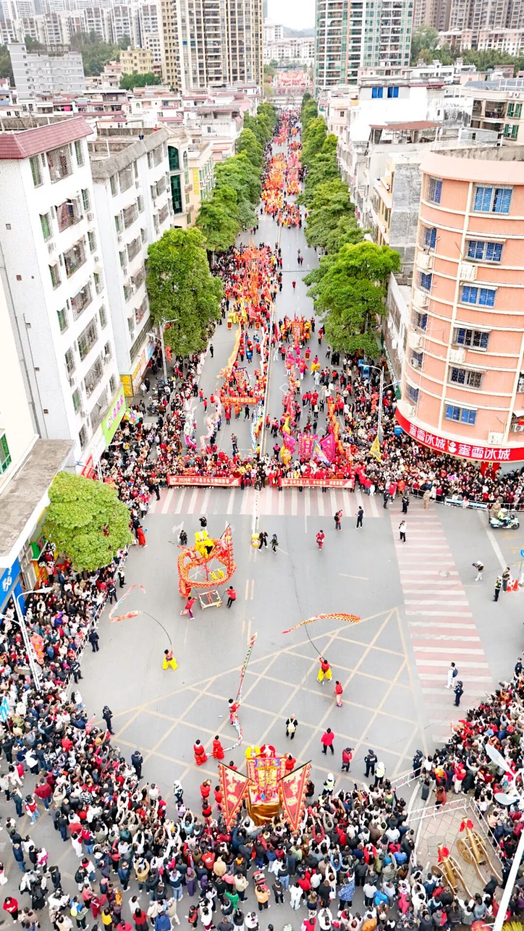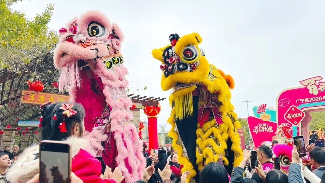 在授旗仪式后,县委副书记、县长何剑才宣布巡游活动“马”上出发!在震天锣鼓中,巡游队伍有序启程,礼仪人员手持祝福横幅走在前列,马年玩偶、财神吉祥物与市民互动送福。8支龙灯队昂首飞扬,8支山狮队灵动俏皮,72支南狮队威风凛凛。锣鼓声、欢呼声沿途蔓延,将新春喜庆传递至竹乡大街小巷,让市民沉浸式感受广宁新春仪式感。